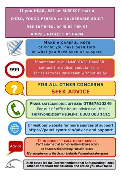The Panel Safeguarding Officer – Julie Edwards is the designated safeguarding officer for the Union of Welsh Independents and should be contacted and informed of concerns and safeguarding incidents within the church. Contact the Panel officet o report or disclose current or historic abuse or a safeguarding concern. During office hours, contact: 07957510346 / 01745817584