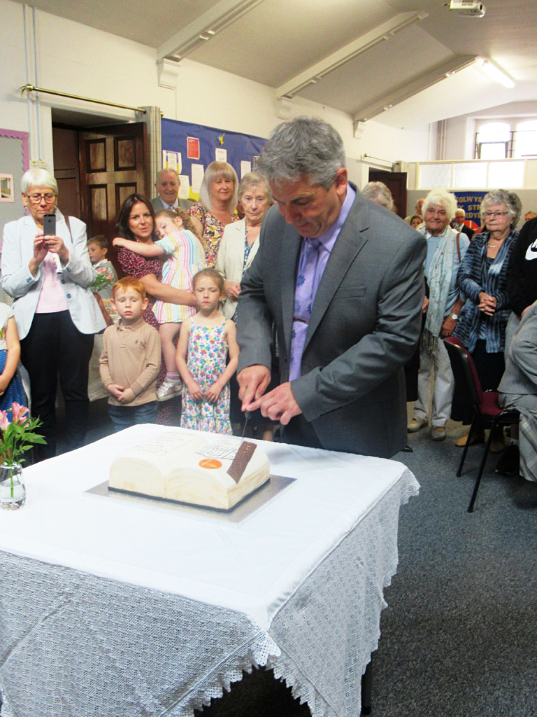 Daeth cyfle ar ôl yr oedfa foreol, dros gymdeithas, cwpaned o de, danteithion blasus a chacen arbennig, i ddatgan ein gwerthfawrogiad o weinidogaeth ddisglair ein gweinidog. Bethan Jones, ysgrifennydd yr eglwys, fu’n enau agoriadol i ddiolchgarwch yr eglwys: ‘mae pob un ohonom, o’r ieuengaf i’r hynaf, i ddefnyddio un o hoff ymadroddion y gweinidog, yn gwybod yn iawn am ei weinidogaeth llawn bendith, ei gyfeillgarwch, ei allu a’i ddoniau niferus ac eang.’ Ac wrth sôn yn benodol am y 30 mis diwethaf yn dilyn y penderfyniad anorfod ’nôl ym mis Mawrth 2020 i hepgor, am y tro, pob gweithgaredd yn y capel, atgoffwyd pawb o’r ddwy daflen oedfa a ddosbarthwyd ar ddechrau’r cyfnod ... ac am y 60 taflen ddilynol, ynghyd â thaflenni gweddi ychwanegol, fu’n fodd i sicrhau ein bod, hyd yn oed pan nad oedd modd ‘dod’ i’r capel, yn medru cyd-addoli dan arweiniad ein gweinidog. Cyflwynodd Eleri Morgan, un o ddiaconiaid yr eglwys, gywydd o waith Llŷr Gwyn Lewis (un o’n diaconiaid sydd bellach hefyd yn brifardd ond a oedd yn methu bod yn bresennol). Cywydd oedd hwn a oedd yn cwmpasu holl waith a doniau Owain Llŷr yn ein plith ac yn crynhoi gwerthfawrogiad y gynulleidfa gyfan am ei arweiniad dros yr 20 mlynedd.