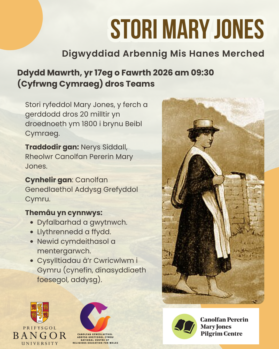 Fel rhan o raglen Mis Hanes Merched 2026, mae Canolfan Genedlaethol Addysg Grefyddol Cymru ac Adran Athroniaeth, Moeseg a Chrefydd ym Mhrifysgol Bangor yn cynnal digwyddiad ar-lein arbennig.