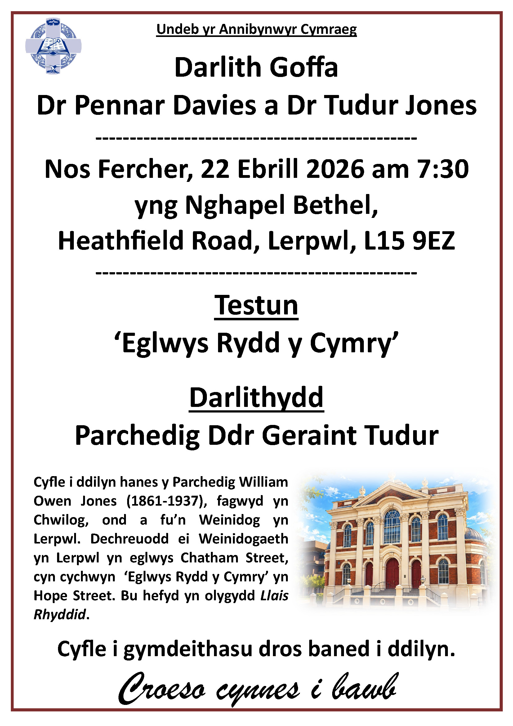 Nos Fercher 22 Ebrill am 7.30 mi fydd y Parchg Ddr Geraint Tudur yn traddodi darlith am 'Eglwys Rydd y Cymry' yn Lerpwl.